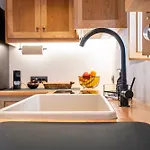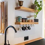 Ugn och diskmaskin finns i ett utrustat pentry för din egen matlagning. En terrass vetter mot trädgården.